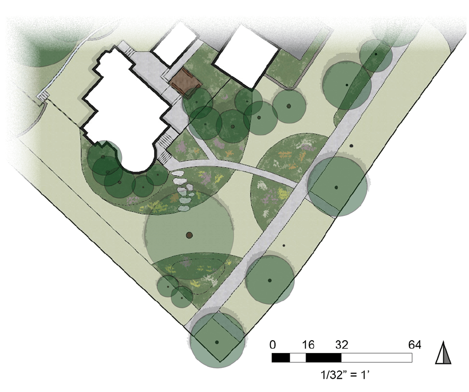 Designs consist of a scaled plan that graphically displays various elements and interventions that are being proposed to the landscape. Designs may also include planting plans, stormwater plans, material descriptions, construction details, and a cost estimate for installation service.